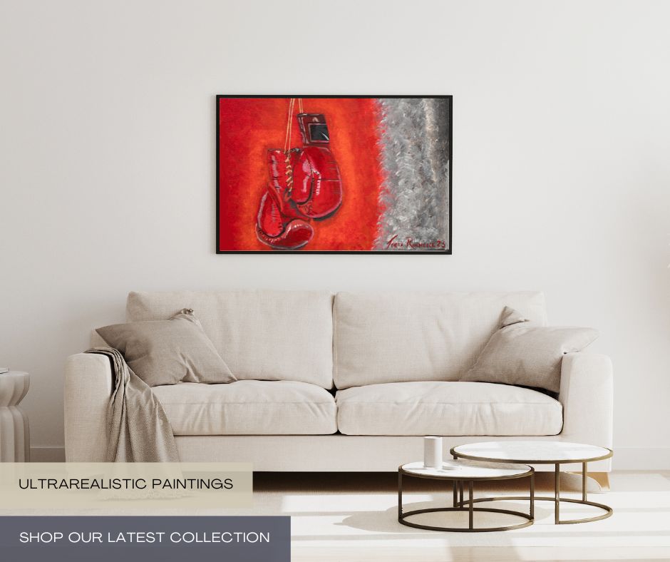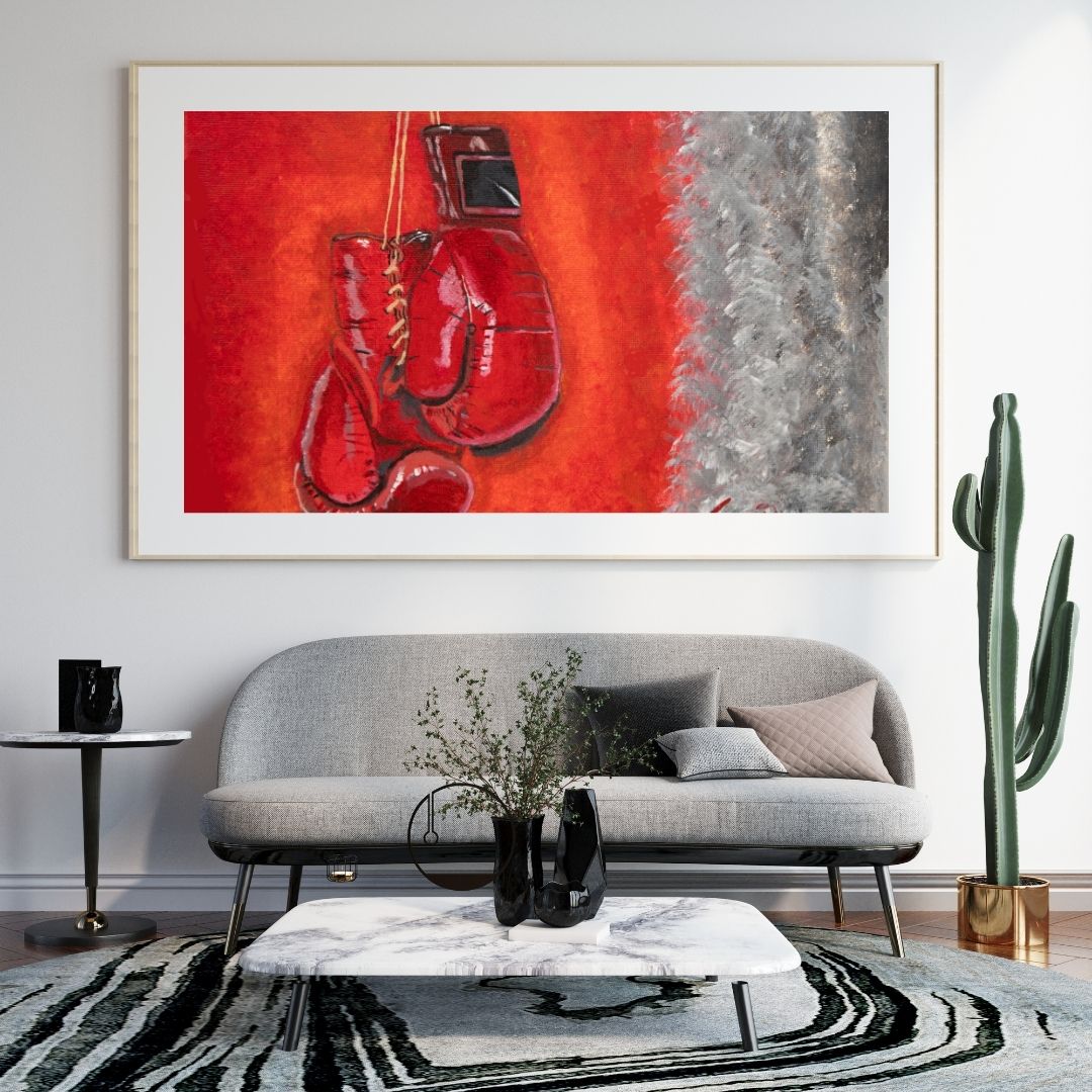 Symbolic and bold, Hanging Up the Gloves represents resilience, strength, and the decision to step away with dignity. The gloves dangle with quiet power, their worn details hinting at stories of struggle and triumph. Strong contrasts of light and shadow bring depth, while the compact scale gives the piece an intimate, personal weight.