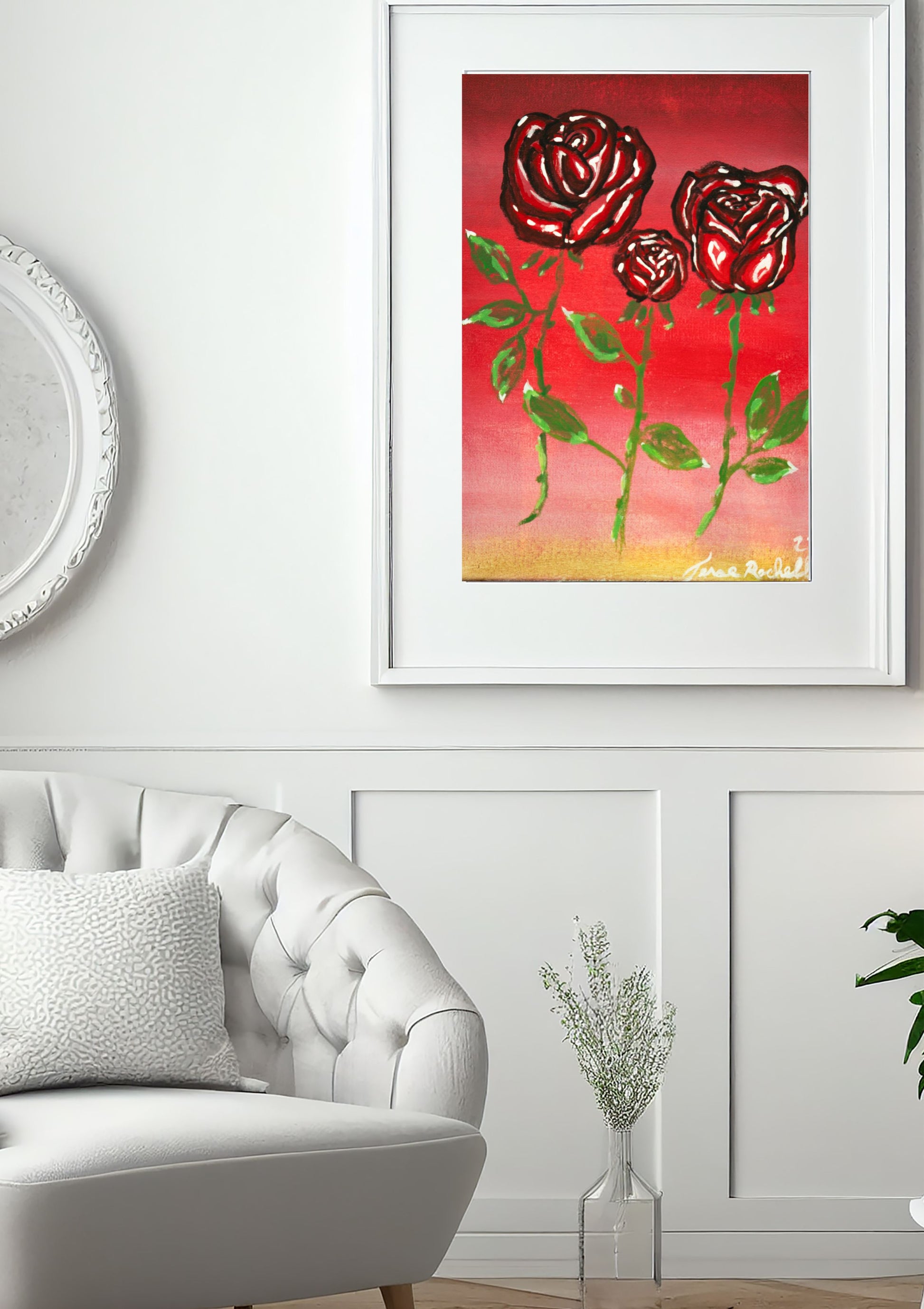 Set against a rich red gradient, this piece features three abstract roses standing tall with presence and individuality. Bold brushwork and high-contrast highlights give each bloom a sense of strength and story, while the composition leaves space for interpretation — a tribute to beauty, memory, and emotional distance.
